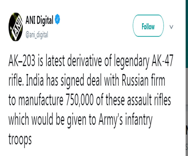 बता दें कि रूस ने दस साल पहले भारतीय सेना के लिए AK-47 राइफल के नए वर्जन की पेशकश की थी। उस समय दोनों देशों के बीच AK–103 राइफल पर बात हुई थी लेकिन डील पक्की नहीं हो पायी थी। अब भारत सरकार और रूस के बीच 2018 का मॉडल AK–203 पर सहमति बनी है। बताया जाता है कि AK सीरीज की यह सबसे खतरनाक राइफल है।